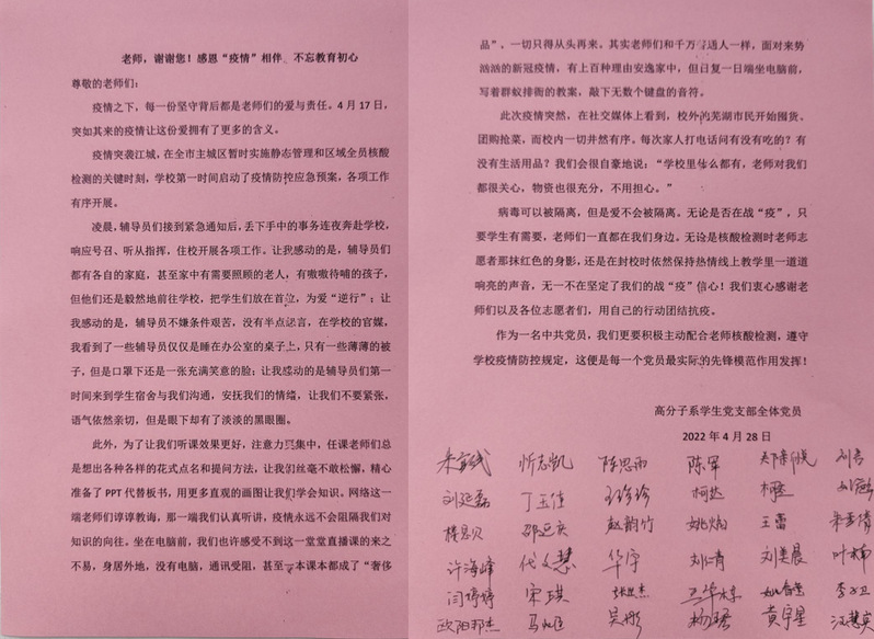活动中,一封由支部全体员工党员签名的“老师,谢谢您!感恩‘疫情’相伴,不忘教育初心”的感谢信,让大家感动至深。“病毒可以被隔离,但是爱不会被隔离;无论是否在战‘疫’,只要员工有需要,老师们一直都在我们身边……”