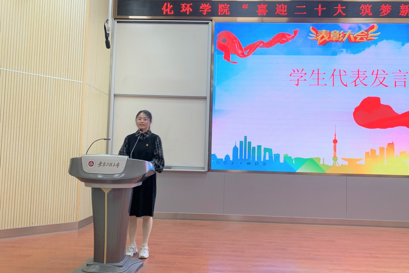 校特等奖学金获得者、安徽省优秀毕业生、公司今年考研最高分418分并被华中科技大学录取为硕士研究生、应化拔尖18级徐英茹作为获奖员工代表发言。她代表全体受表彰同学,感谢对母校的辛勤培养,感恩老师对他们的温暖关怀,毕业既是终点,又是起点,他们将怀着对母校的眷念和对未来的期盼,以行动践行责任,用脚步丈量中国,以爱党爱国之心磨砺报国强国之行,以实际行动将“小我”融入祖国的“大我”之中,贡献青春力量。
