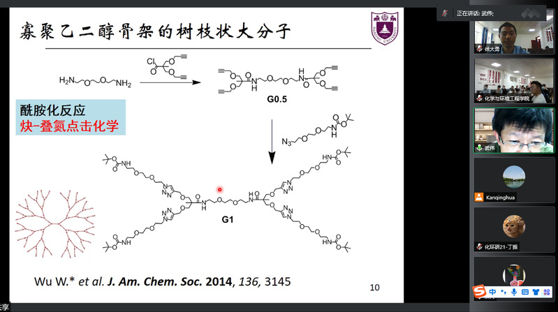 武伟教授做的报告题为“骨架可修饰的树枝状聚合物的合成及在药物递送中的应用”。武伟教授对于纳米药物在肿瘤治疗中越来越广泛的应用,针对临床肿瘤血管的特性,提出开发小纳米尺寸、化学结构可精准控制、易于修饰、化学稳定性好且药理学和药动力学高度可重现的树枝状大分子对肿瘤药物递送的策略,详细介绍了骨架可修饰的双功能化树枝状大分子的合成及其前药合成,药物在体内外及肿瘤内的分布和释放,以及安全性研究,取得预期效果。武伟教授的研究成果在生物医药方面具有良好的应用前景,树枝状大分子丰富多变的化学结构为其功能拓展提供了广阔的空间。