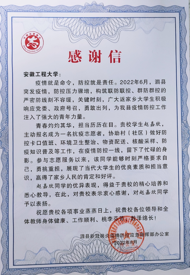 信中指出,2022年6月,泗县突发疫情,赵嘉欣积极响应党委、政府号召,勇敢出列,主动报名成为一名抗疫志愿者,该同学能够时刻严格要求自己,展现了当代老员工的优良素质和担当意识,赢得了家乡人民的肯定和好评。赵嘉欣同学的优异表现,得益于贵校的精心培养和悉心教导,祝愿贵校各项事业蒸蒸日上,祝贵校各位领导和全体教师身体健康、工作顺利、桃李芬芳学教泽绵长!