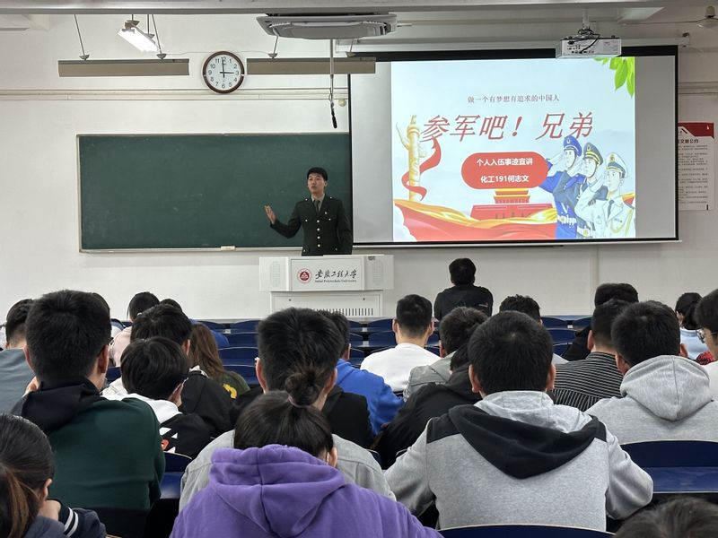 赵成婧围绕征兵政策、享受待遇、入伍条件、入伍流程、常见问题答疑等方面做了详细介绍,并向在场的各位同学科普老员工入伍可享受的国家资助学费、入伍奖励金、退役复学转专业、退役后就业创业优待等一系列政策,鼓励怀揣梦想的有志青年投身军营,鼓舞了同学们的参军热情。
