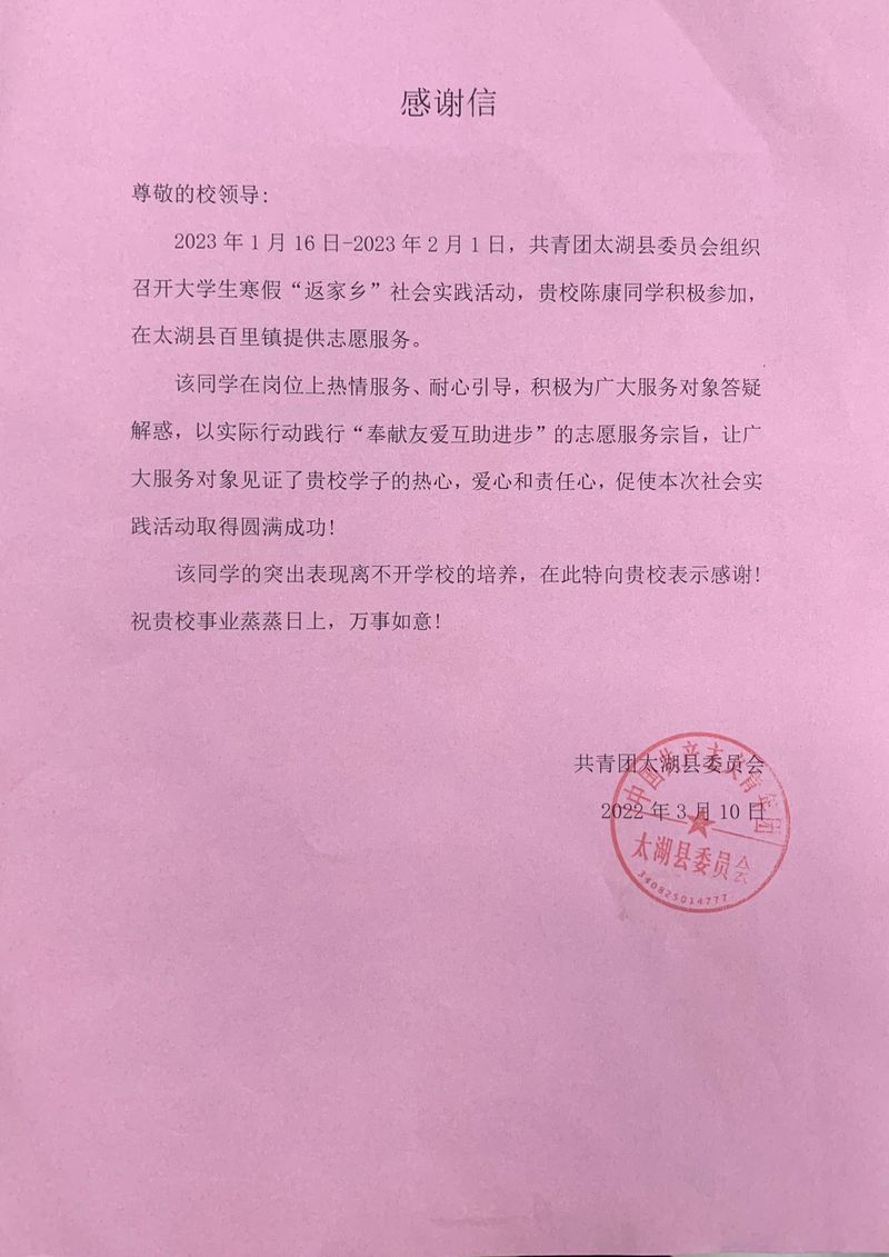 近日,公司收到一封来自共青团太湖县委员会的感谢信,信中对​英国上市公司365应化213班陈康同学在老员工寒假“返家乡”社会实践活动中所做出的贡献予以肯定和表扬。