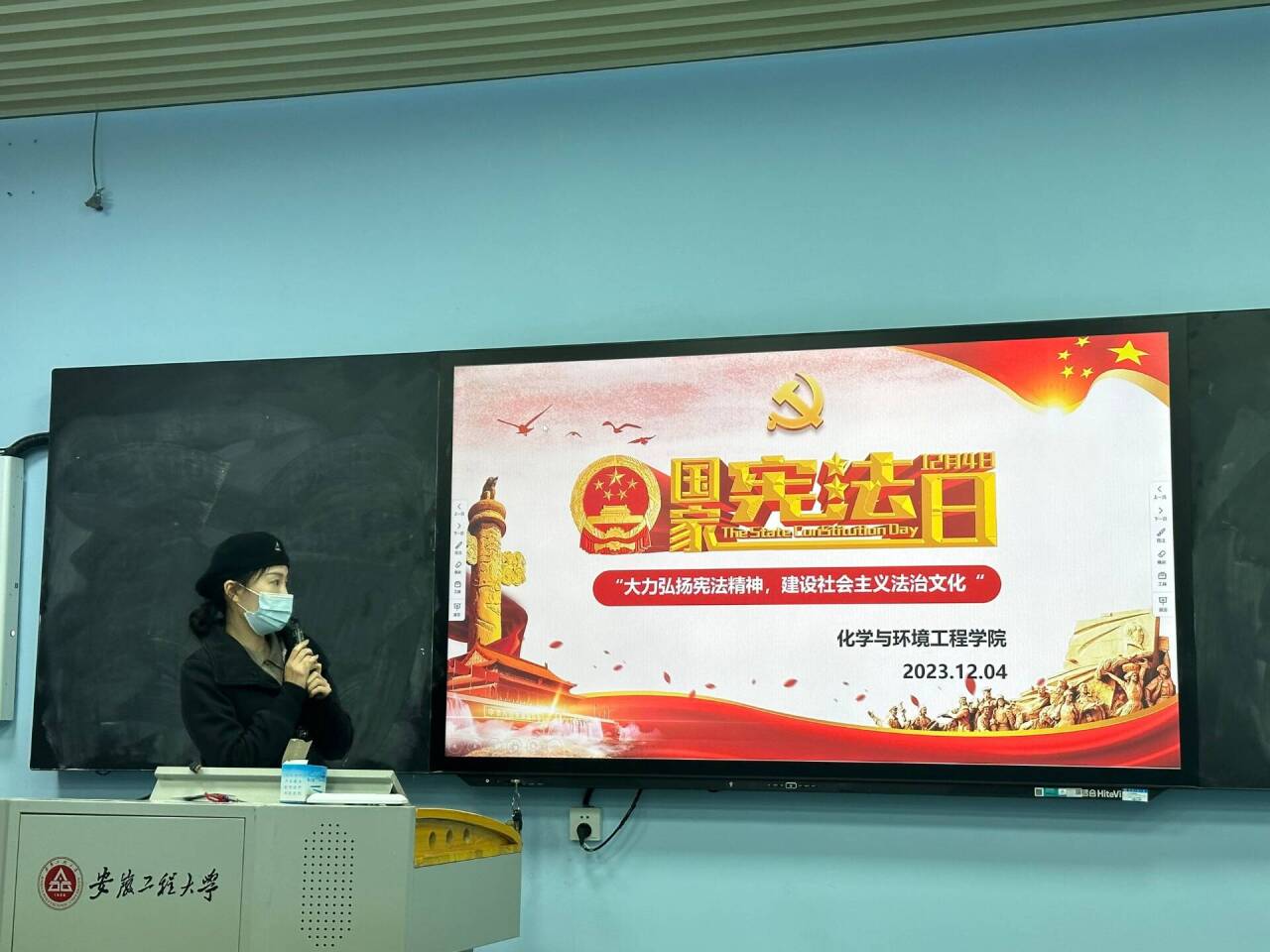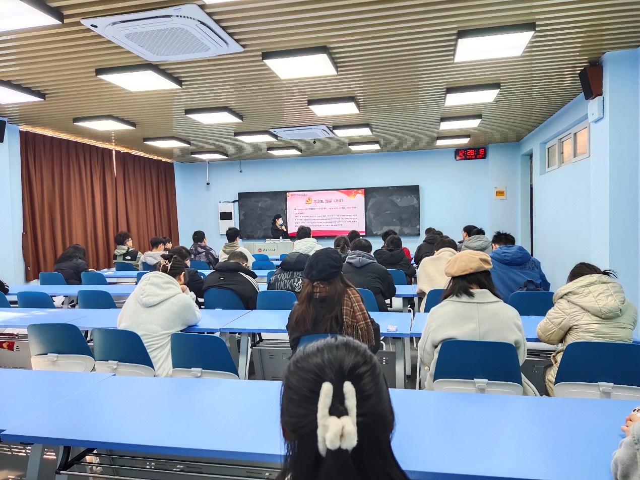 接着,研究生辅导员张帆以“礼敬宪法 法润校园”为题,采用PPT课件辅助讲解的形式,介绍了宪法的发展历程、宪法日的确立、宪法的地位、宪法规定的公民基本权利义务等内容,通过联系生活实际、结合具体案例全面普及宪法知识。重点强调青年要树立宪法信仰,自觉将宪法作为行动指南;在行使自由和权利的同时要注意边界,不得损害国家的、社会的、集体的利益和其他公民的合法的自由和权利。