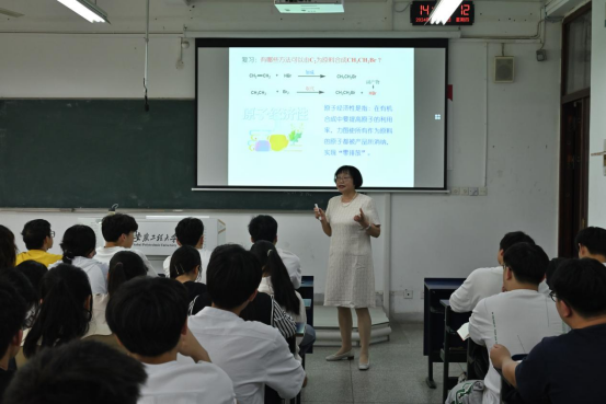 周虹屏教授通过巧妙设计一道思考题来总结回顾上节课知识点,同时联系到实际应用,进一步切入到新的授课内容。在教学过程中,结合现实生活中的常见现象,生动浅显地介绍深奥难懂的反应机理。比如,通过风中雨伞方向的改变来解释反应中化合物构型的变化。同时,将课程思政元素自然融入到教学内容,在讲授原子经济性时联系到“绿水青山就是金山银山”;讲授人名反应时,激励员工好好学习,潜心科研,为我国的科研发展做贡献等理念。周老师注重启发式教学,鼓励员工要根据所学知识大胆猜测,积极思考,形成行之有效的学习方法和学习习惯。教学形式丰富多样,PPT内容丰富,板书清晰,课堂节奏松弛有度。课堂生动有趣,员工参与程度高,气氛非常活跃。