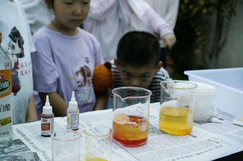 上午9时,志愿者们提前布置好实验场地,透明玻璃杯、食用油、白醋、小苏打、食用色素等材料整齐摆放,吸引了不少小朋友驻足围观。“大家知道吗?今天我们要做一个‘会跳舞的熔岩灯’,而这些普通的材料,就是我们探索科学的‘魔法道具’。”志愿者的开场白瞬间点燃了孩子们的兴趣。