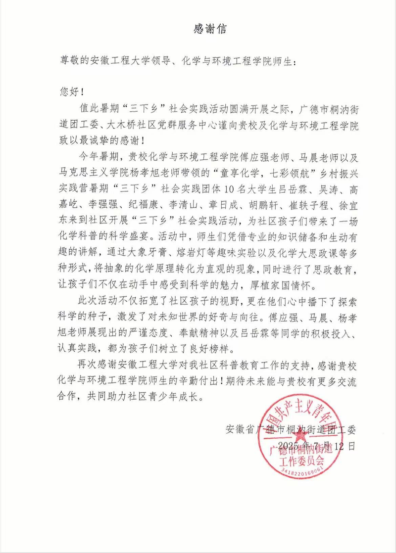 2025年7月11日,化环公司“童享化学,七彩领航”乡村振兴实践营暨暑期“三下乡”社会实践项目结营仪式在桐汭街道大木桥社区党群服务中心温馨举行。为期一周的化学科普公益项目画上圆满句号,桐汭街道团工委还向项目团队赠予感谢信,以表对团队辛勤付出的肯定与谢意。