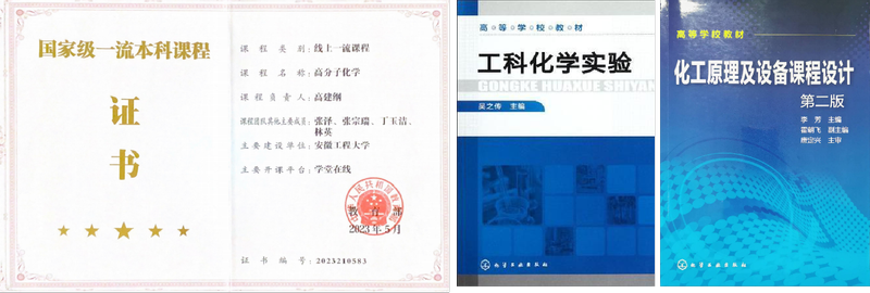 课程思政建设走深走实。按照“有温度有深度”的特色持续推进课程思政、专业思政一体化建设。获省级课程思政示范课2门,校级课程思政示范课6门,课程思政优质课23门,校级优秀案例3项,校级课程思政教学名师1人,获教学创新大赛课程思政组校级一等奖1项、二等奖4项,校级课程思政教学改革项目6项等。课程、教材建设成果突出。《高分子化学》获批国家级一流课程,获批79门省、校级课程思政示范课、线上、线下、混合式、智慧课堂等各类课程。主编/参编《工科化学实验(第三版)》《化工原理及设备课程设计》《材料亚微结构表征技术》《无机化学》等教材,多部教材入选安徽省规划教材,课程建设成效明显。