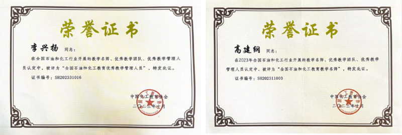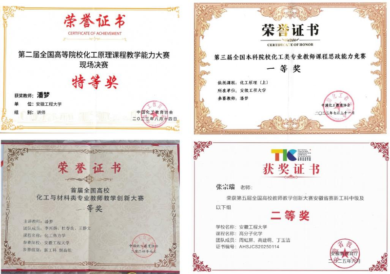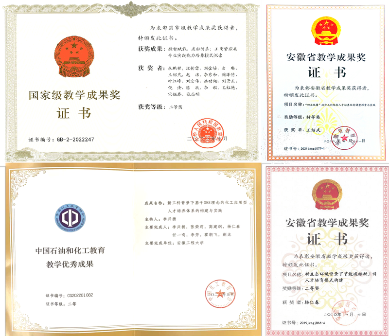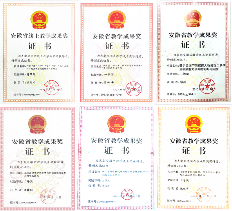 教学成果颇丰。获得国家级教学成果二等奖1项,安徽省特等奖学金2项,一等奖1项,二等奖2项,三等奖5项,中国石油和化工公司产品优秀成果二等奖1项。