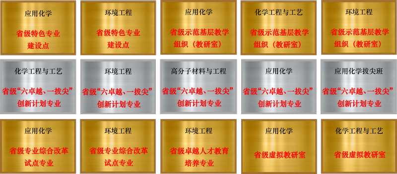 专业建设成效明显。应用化学、化学工程与工艺两个专业入选国家级一流本科专业建设点。化学工程与工艺专业通过工程教育专业认证。化学工程与工艺、环境工程、应用化学、高分子材料与工程四个专业均获省级“六卓越一拔尖”卓越创新计划和传统专业改造提升专业,环境工程和应用化学专业为省级特色专业,化学工程与工艺、环境工程和应用化学获批省级示范基层教学组织(教研室)。