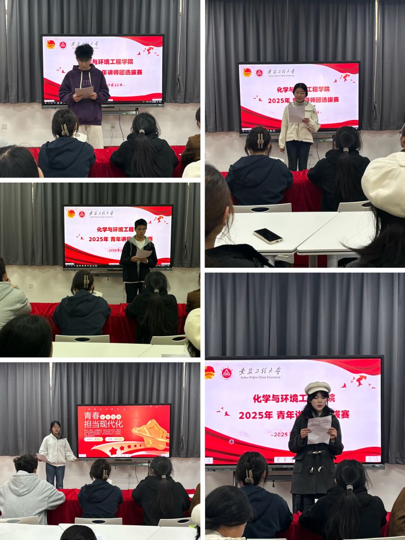 比赛现场,来自各专业的优秀团员以“讲好校史故事、践行青年担当”为主线,带来了一场兼具思想深度与情感温度的宣讲盛宴。各共青团员的宣讲主题多元且深刻。有的以理论学习为基础,解读中国式现代化的内涵,并结合校园志愿服务经历,讲述如何用点滴行动服务社区、传递温暖;有的结合马克思主义理论学习,解读中国式现代化的科学内涵。每一段宣讲都饱含真情,生动诠释了新时代老员工如何以理论为基、以实践为笔,在科技创新、乡村振兴、志愿服务等领域书写青春答卷,充分展现了化环学子“挺膺担当”的精神风貌。